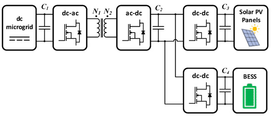 In [20], an analysis and experimental validation of an off-board three-port integrated topology used to interface EV and solar PV panels with the ac power grid is presented. Although the solar PV panels and the EV (instead of stationary BESS) are connected to the same dc-link, the considered topology is non-isolated and the power grid does not present a dc configuration. Furthermore, in [21,22], two power electronics architectures that interface ESS and solar PV panels with the ac power grid are presented. Whilst in [21], galvanic isolation between the ESS and the rest of the system is guaranteed through a dual active bridge (DAB) power converter, the same is no longer the case in [22]. In the latter, non-isolated buck and boost converters are used, as well as a full bridge dc–ac power converter to interface the ac grid. However, in neither case is the purpose of this paper achieved: the development of a unified power converter that allows, in an isolated way and through a single connection point to a dc grid, the interface of solar PV panels and a BESS. Such application is partly suggested in [23], where two non-isolated conversion stages interface with the solar PV panels and the BESS. However, the connection to the dc grid, despite being performed using an isolated topology, employs a dual half-bridge power converter, which, compared to a DAB, has lower switching losses, but, in contrast, has fewer degrees of freedom, resulting in lower energy efficiency [24].