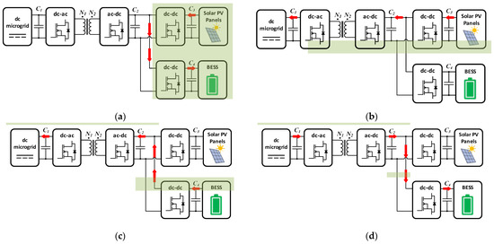 Operation modes for the proposed unified power converter topology: (a) solar PV panels to batteries (PV2B); (b) solar PV panels to dc grid (PV2G); (c) batteries to dc grid (B2G); (d) dc grid to batteries (G2B).