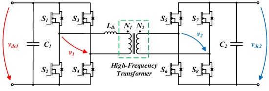 As previously mentioned, it is essential to allow the bidirectional power flow between the dc microgrid, the solar PV panels, and the BESS, but also to ensure galvanic isolation. Thus, a DAB converter has been widely used in the most diverse types of power electronics applications, as is the case of solid-state transformers and medium/high voltage power grids. This isolated topology consists of a full bridge ac–dc converter on each side of a high-frequency transformer, as shown in Figure 4. The purpose of the high-frequency transformer is to provide galvanic isolation to the power system and, according to its turn ratio (N = N1/N2), adjust the voltage on the primary (v1) and secondary (v2) sides to the desired values. Compared to the most distinct isolated topologies, a DAB converter has greater advantages concerning flexibility and efficiency under nominal conditions. For instance, a dual half-bridge topology, despite presenting lower switching losses and costs, has, on the other hand, fewer degrees of freedom, thus decreasing its efficiency.
