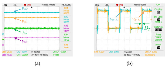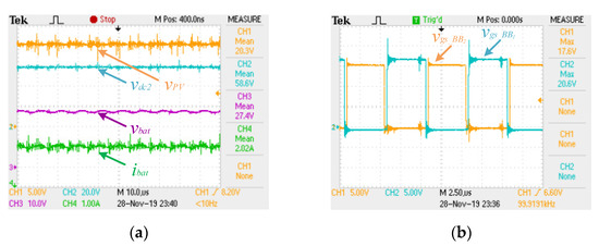 Two PI algorithms were adopted to control vdc2 and the current that flows through the resistive load (ibat), the outputs being applicable, correspondingly, to the back-end boost- and buck–boost-type dc–dc power converters. Thus, a 2 A reference for ibat and a 60 V reference for vdc2 were defined. As Figure 7a shows, the measured values (CH4 and CH2, respectively) converge to the established references. It should also be noted that the voltage on the dc source that simulates the PV panels (vPV, CH1) is 20 V and the voltage on the resistive load (vbat, CH3) is 27.4 V, very close to the theoretical value.