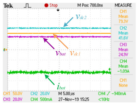 During experimental tests, two dc voltage sources were used, one replacing the BESS and the other emulating the dc grid, connected in parallel with a resistive load of 56 Ω and with the primary dc-link. Thus, this solution was optimized for the injection of a constant current of 1 A into the dc grid during the moment that vbat is 25 V (discharge power of 25 W). By observing Figure 9, it is verified that vbat and ibat (CH3 and CH4, correspondingly) converge to their references. Furthermore, vdc2 (CH2) is referenced to 40 V and presents a mean value of 41.6 V, which, considering the N of the high-frequency transformer, is reflected in the existence of a voltage of 79.3 V on the dc grid (vdc1, CH1).