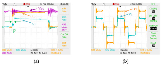 Figure 10 shows an unbalanced situation, in which the ratio v1/v2 is different from N, even though vdc2 converges to its reference. In this extreme case, in which φ is maximum and assumes the value of 30⁰, the robustness of the DPS algorithm in the face of variations in the nominal operating conditions is proven. This effect can also be seen in Figure 11a, wherein the waveforms of v1 and v2 (CH1 and CH2, respectively) are presented in the same unbalanced situation. Nevertheless, in Figure 11b, the same waveforms are presented in a situation of equilibrium about the ratio v1/v2, and as can be seen, the value of φ is almost zero. It should also be noted that the results obtained Figure 11a,b are related to an experimental test carried out when the reference for vdc2 was 30 V.