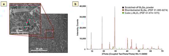 To increase the effective interaction surface between the electrode and the electrolyte, the synthesis method for Bi2Se3 thin films with nanoplates that grow at different angles (partly disordered) to the substrate surface was selected [32,33] (Figure 1a). This type of Bi2Se3 morphology has no dead volume or gap spacing shrinkage [34] which could lead to the decrease of the anode active sites, thus making it a promising candidate as anode material for ARLIBs. The size of the nanoplates varied between 1.0 and 8.0 μm. The thickness of the synthesized Bi2Se3 thin films with partly disordered nanoplates was between 350 and 500 nm. The EDX spectra (Supplementary Figure S2) showed intensive peaks of C, O, Se, Si, and Bi. Si, O, and C peaks were the background signals from the microscope glass slides on which Bi2Se3 was synthesized. The Se/Bi atomic ratio determined from the EDX spectra was 1.44 ± 0.03, which is close to the theoretical stoichiometric ratio of Bi2Se3 (1.50) and indicates a rather uniform chemical composition of the films. The XRD pattern (Figure 1b) of Bi2Se3 powder obtained by scratching the synthesized thin film off the substrate showed Bi2Se3 diffraction peaks, which refer to the rhombohedral (R-3 m) crystal system of Bi2Se3 (Ref. card No. PDF 01-085-9274): a = b = 4.13850 Å; c = 28.62400 Å, as well as cubic γ-Bi2O3 (I23) (Ref. card. No. PDF 01-074-1375) with crystal system a = b = c = 10.08000 Å. It should be noted that the difference in the peak intensity ratios between the reference cards and the actual XRD patterns obtained for the powdered Bi2Se3 thin films most likely are related to the impact of the substrate on the growth of Bi2Se3 thin films, resulting in the domination of certain crystallographic growth directions [32,33]. The formation of Bi2O3 could be explained by the oxidation of Bi2Se3 powder, which, due to its increased surface area after scratching, is more prone to oxidation in an ambient environment.