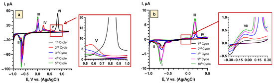 For both samples with the formed SEI layer and with the Bi2O3 layer, the intensities of peaks corresponding to Li+ intercalation/deintercalation processes (I, III) in subsequent cycles increased (Figure 2a,b). The increase in the intensity of Li+ intercalation/deintercalation processes may be related to the pre-treatment of Bi2Se3. The pre-treatment involves the stabilization of the SEI (−1.0 ÷ 1.3 V vs. Ag/AgCl) and the Bi2O3 (−1.0 ÷ 0.5 V vs. Ag/AgCl) layers until their continuous coverage of the entire electrode’s surface.