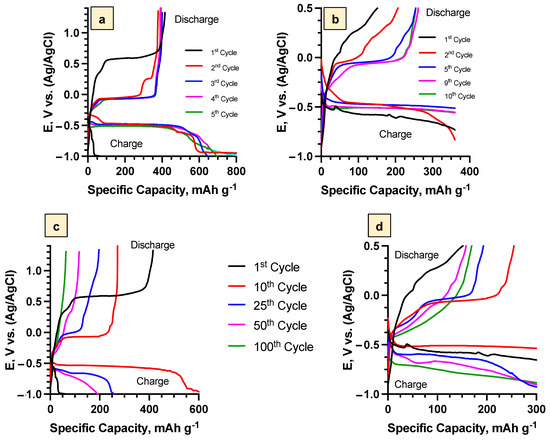 Charge/Discharge profiles of Bi2Se3 thin films in 5 M LiNO3 at 1 C: (a)—first 5 cycles for the SEI layer (−1.0 V ÷ 1.3 V), (b)—first 10 cycles for the Bi2O3 layer (−1.0 V ÷ 0.5 V), (c)—profiles up to the 100th cycle for the SEI layer (−1.0 V ÷ 1.3 V), (d)—profiles up to the 100th cycle for the Bi2O3 layer (−1.0 V ÷ 0.5 V).
