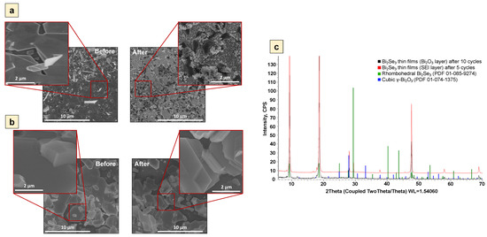 SEM images and XRD patterns acquired from the samples’ surface XPS spectra demonstrated the structural differences of the Bi2Se3 thin film surface before and after 5 cycles and 10 cycles for the samples covered with continuous SEI and Bi2O3 layers, respectively (Figure 4 and Figure 5).