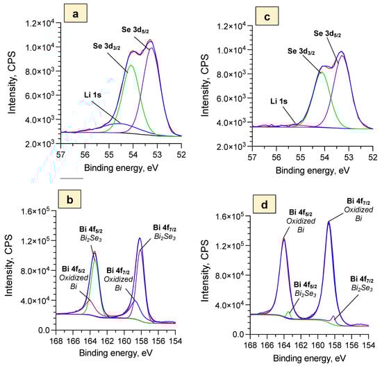 XPS spectra of Bi2Se3 thin films in 5 M LiNO3 after cyclic voltammetry measurements for: (a)—SEI layer Se 3d and Li 1s data after 5 cycles (−1.0 V ÷ 1.3 V), (b)—SEI layer Bi 4f data after 5 cycles (−1.0 V ÷ 1.3 V), (c)—Bi2O3 layer Se 3f and Li 1s data after 10 cycles (−1.0 V ÷ 0.5 V), (d)—Bi2O3 layer Bi 4f data after 10 cycles (−1.0 V ÷ 0.5 V).