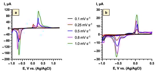 Cyclic voltammetry curves of Bi2Se3 thin films in 5 M LiNO3 in the scan rate range from 0.1 to 1.0 mV s−1 after surface pre-treatment for: (a)—SEI layer after third cycle (−1.0 V ÷ 1.3 V vs. Ag/AgCl), (b)—Bi2O3 layer after ninth cycle (−1.0 V ÷ 0.5 V vs. Ag/AgCl).