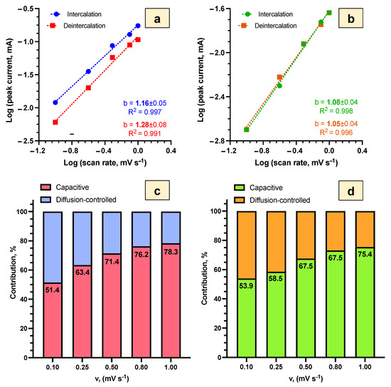 Calculated from the linear regression slopes (Figure 7a,b), the b-values for both samples with SEI and Bi2O3 layers varied from 1.05 to 1.28, indicating the dominant contribution of the capacitive process (pseudo-capacitance and electrical double-layer capacitance) to the Li+ intercalation/deintercalation in both potential ranges. The quantitative contribution of the capacitive and diffusion-based processes in Li+ intercalation/deintercalation at different scan rates (Figure 7c,d) was determined by Equation (8):