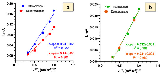 Dependence of v1/2 vs. I for Bi2Se3 thin films in 5 M LiNO3 for Li+ intercalation/deintercalation with fitted slope values for: (a)—SEI layer (−1.0 V ÷ 1.3 V vs. Ag/AgCl), (b)—Bi2O3 layer ( −1.0 V ÷ 0.5 V vs. Ag/AgCl).