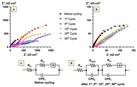 From the 1st to the 100th cycle, a small semicircle corresponding to Rlayer was observed in the low-frequency range (Figure 9a,b). For the sample with the formed SEI layer, Rlayer gradually decreased ~10 times from the 1st to the 100th cycle, probably indicating the mechanical and electrochemical degradation of the SEI layer by becoming more porous with cracks and cavities on the electrode surface [55,56].
