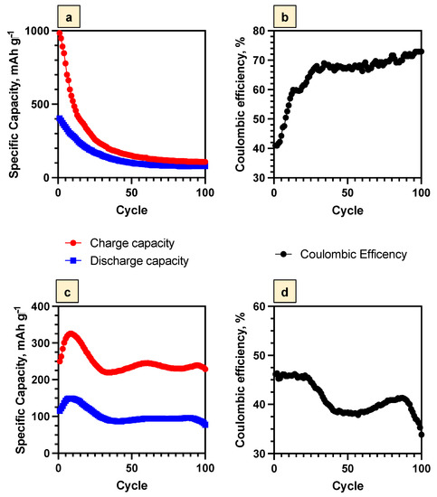Charge/discharge profiles up to 100 cycles for the samples with the SEI and Bi2O3 layers demonstrated Li+ intercalation/deintercalation plateaus from the 5th to 25th cycle (Figure 3c,d). After the 25th cycle, these plateaus were not observable anymore, which might be due to the fast process of Li+ intercalation/deintercalation [45].