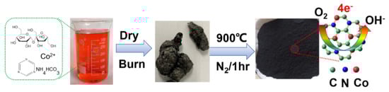 As displayed in Figure 1, sugar powder (3 g), NH4HCO3 (0.8 g), melamine (2.4 g), Co(NO3)2.6H2O (0.1 g) were mixed with purified water to prepare a solution, which was then dried, ground in a mortar, and burned to obtain a snake-like foam ash. The ash was then pyrolyzed in a tubular furnace with a nitrogen stream of 60 mL min−1 at 900 °C for 1 h with a rate of temperature increase of 5 °C min−1. A black carbon material (Co/N-C-900) was obtained when the furnace was cooled to room temperature. The temperature–time curve is presented in Figure S1 in the Supplementary Materials (ESI). The Co/N-C was also prepared with pyrolyzing temperatures of 800 (Co/N-C-800) and 1000 °C (Co/N-C-1000) to investigate the influence of the pyrolyzing temperature on catalytic activity.