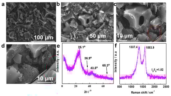 (a–d) SEM images at various magnifications for Co/N-C-900 (d presents enlarged image of the part in the red circle of c), (e) XRD pattern, (f) Raman spectra.