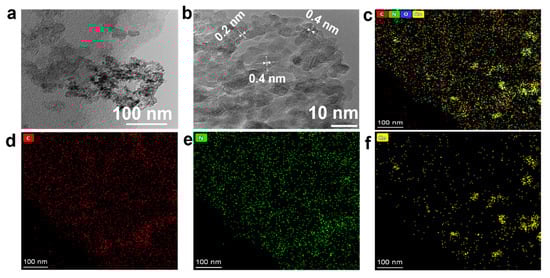 The crystallography of the Co/N-C-900 was studied using XRD (Figure 2e). The peaks at around 25.1 and 43.5° are related to the graphite (002, ICDD#41-1487) and (100) planes, respectively []. The two peaks indicate the formation of the graphite phase. The broad XRD peaks imply that crystallization is relatively low [], and this is supported by the HRTEM images (Figure 3b). The peaks at 36.9 and 65.3° (ICDD # 00-042-1467) can be attributed to Co3O4 [], implying that Co has been doped into the carbon matrix. Figure 2f shows the Raman spectra for Co/N-C-900. Two peaks appear at 1337.4 and 1583.9 cm−1 for the D and G bands, respectively. The peak for the D band is related to the disordered structure, implying that the graphite was successful dopped with heteroatoms []. The G band peak is related to the sp2 hybridized carbon atoms []. The ID/IG for Co/N-C-900 is 1.02. This value is close to or higher than those of many other catalysts []. The high ID/IG suggests the richness of defective domains. This demonstrates that the Pharaoh’s Snakes reaction is effective for fabricating the defective domains of the carbon material, and the defective domains are beneficial to catalytic performance [].