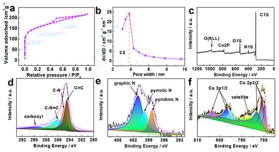 (a) Nitrogen sorption/desorption isotherm of the Co/N-C-900, (b) the corresponding pore width distribution curve, (c) XPS spectra survey of Co/N-C-900, (d) C1s XPS spectra, (e) N1s XPS spectra, (f) Co2p XPS spectra.