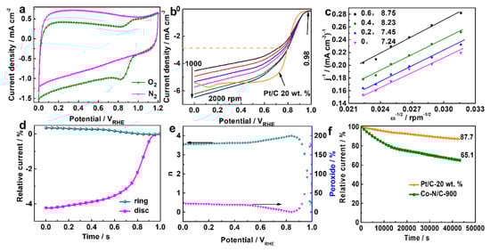 RRDE technology as applied to further evaluate the pathways for the ORR on the Co/N-C-900. As shown in Figure 5d, a low ring current density (∼0.25 mA cm−2) for peroxide oxidation and high disk current density (∼4.2 mA cm−2) for O2 reduction can be observed, implying a small amount of H2O2 generation and high catalytic performance toward ORR []. The n and HO2−% were calculated according to Equations (3) and (4), respectively [].