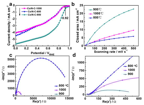 (a) LSV for the Co/N-C prepared at various temperatures, (b) CV closed area vs. scanning rate, (c) EIS, (d) enlarged EIS of the high-frequency part.