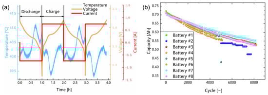 Battery aging cycle schemes and capacity degradation profiles. (a) Completed aging cycle test for voltage, current and temperature. (b) Battery capacity degradation curves of the eight batteries.