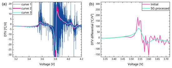 Noise will be generated in practical measurements due to fluctuations in signal sampling, especially temperature data, which is much louder than the voltage current data as shown in Figure 1a. Furthermore, the error caused by noise will be further amplified due to the differential operation and the obtained DTV curve will contain a lot of noise.