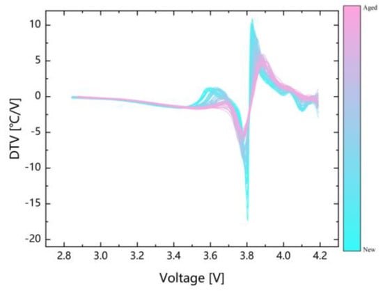 The DTV method is an important tool for tracking battery health conditions, which could be utilized to evaluate the patterns of battery degradation process. The battery degradation is a complex physicochemical process. Therefore, the analysis of internal mechanism and measurement of parameters could be challenging. The change of entropy is a function of temperature, and the DTV method could provide obvious information related to entropy. Some feature variables, such as positions and heights of peak and valleys of the curve, are directly concerned with the impedance increment and nonuniform of electrode performance during battery degradation process, reflecting the phase transition characteristic. During the whole battery degradation process, the positive and negative electrodes are in different phase combinations. The transition between these phases may lead to a sudden change in entropy, which may lead to the emergence of inflection points on the DTV curve. Specifically, the peak position describes the peak potential during the (de) intercalation stage. The peak position shift during aging can describe the impedance rise and stoichiometric drift of the battery. The peak height represents the maximum heating rate of these stages. The peak width describes the potential window of the combined phase in the two electrodes. The peak area gives information about the heat generated during the (de) intercalation stage. The phase transition characteristic is closely related to the battery degradation, thus providing close links between DTV features and battery degradation.