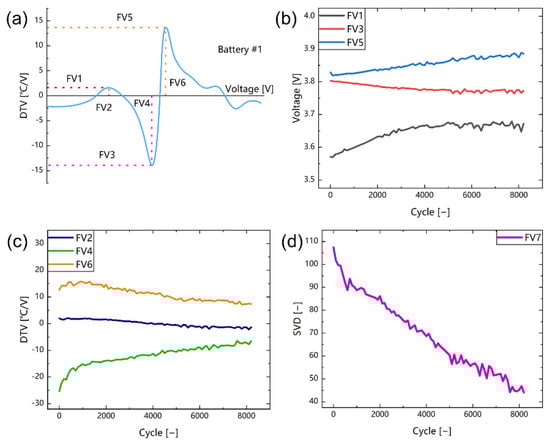 where is a mapping function between voltage and DTV, and and are the voltages of the previous sampling time point and the later sampling time point, respectively. As shown in Figure 5a, the coordinates of the first peak, the valley, and the second peak are [FV1, FV2], [FV3, FV4], and [FV5, FV6], respectively. In addition, FV1, FV2, FV3, FV4, FV5, and FV6 represent the values of , , , , , and , respectively. With the increase of aging cycle, the specific change processes of feature variables of battery #1 are shown in Figure 5b,c.