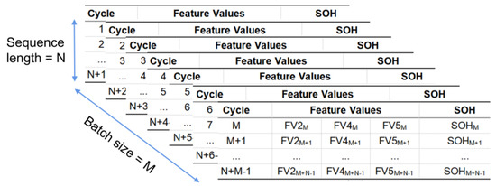 Where FV represents features, M the batch size, SOH the capacity and N the sequence length. The timeseries are constructed using the extracted features and the input is constructed as a three-dimensional timeseries tensor. The extracted feature variables are first constructed into a two-dimensional matrix. Next, two-dimensional matrix fragments are extracted from the above two-dimensional matrix according to the sequence length N. Next, a series of two-dimensional matrix fragments are constructed into a three-dimensional tensor as the final input according to a given combination of batch sizes M. The features of each two cycles are used as a time series to predict the capacity of the second of these cycles, and the two adjacent timeseries will have an overlap of data points to make full use of our data.