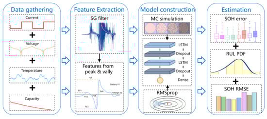 The specific framework of LSTM-based battery SOH and RUL prediction proposed in this paper is shown in Figure 8. The framework is divided into four parts: preprocessing, filtering and feature extraction, model construction and training, validation and error analysis.
