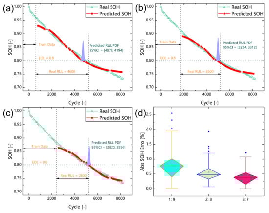 In this subsection, the variation of SOH and RUL prediction results with different division proportions of the dataset are investigated to verify the early prediction ability of the proposed model. The Red dotted line represents the predicted SOH and the green dotted line represents the real SOH. The division proportion is demonstrated with the black lines. The purple area is generated with Monte Carlo simulation to obtain the probability distribution of RUL. Three division proportions of dataset are executed in this subsection, including 10%, 20% and 30%, respectively. As shown in Figure 9a, the error of prediction is 0.714% when using 10% of data for training. The RUL is 4600 cycles, and the probability density of battery RUL is distributed between 4079 and 4194 cycles. Figure 9b shows that the error of prediction is 0.473% when using 20% of data for training. The RUL is 3500 cycles and the probability density of battery RUL is distributed between 3254 and 3312 cycles. The precision is significantly higher than the results using 10% of data for training. Figure 9c shows that the error of prediction is 0.363% when using 30% of data for training. The RUL is the 2800 cycles, and the probability density of battery RUL is distributed between 2820 and 2856 cycles. Figure 9d shows the box plot of the predicted results, which avoids the effect of extreme outliers and provides a visual table of the error distribution conditions with small rectangles in each box representing the MAE. The box plot could show the characteristic of the error distribution through maximum, minimum, median, upper quartile and lower quartile. With the proportion of the training set increasing, the upper quartile gradually decreases from 1.1% to 0.75% and to 0.5%, and the lower quartile gradually decreases from 0.4% to 0.25% and to 0.15%. The MAE also decreases from 0.8% to 0.6% and to 0.3%.
