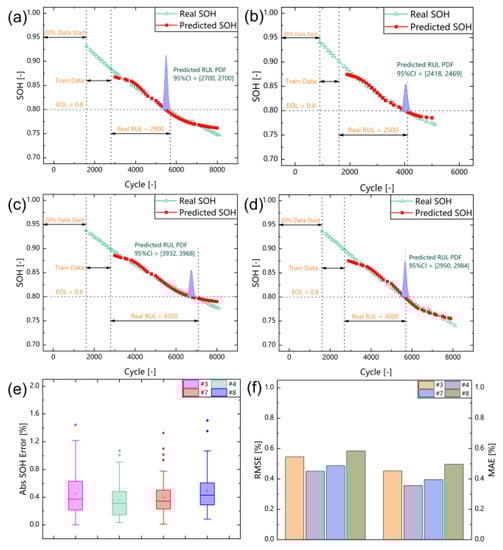 As shown in Figure 10e,f, the prediction results with the data of 20% cycles lost could produce a prediction mean absolute error of around 0.4%, which is close to 0.473% without data lost. Furthermore, the lower and upper quartiles and MAE of box line plot are distributed around 0.25%, 0.6% and 0.75%, respectively, further proving the robustness and stability of our model.