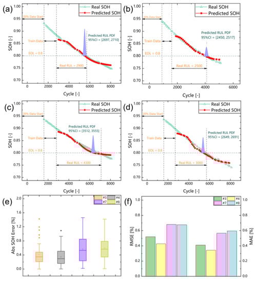 Validation of robustness of the proposed model. (a) Estimation results for battery #3. (b) Estimation results for battery #4. (c) Estimation results for battery #7. (d) Estimation results for battery #8. (e) Box-plot analysis for four batteries. (f) RMSE and MAE analysis for four batteries.
