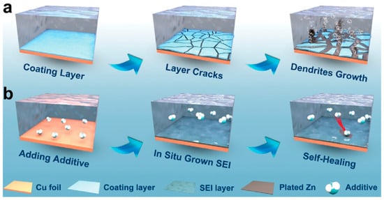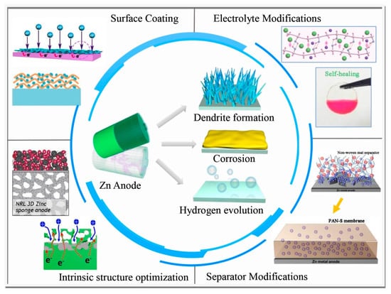 So far, many advanced foresighted strategies have been proposed to tackle the issues of zinc dendrites and surface side reactions, which mainly consist of constructing ion coordination layers on the zinc anodes [16], establishing fast stereoscopic channels for ions to achieve uniform ion distribution [17,18], building charge uniform distribution coatings [19,20], designing stereoscopic structures [21,22], optimizing electrolyte additives [23,24,25,26], etc., as presented in Figure 1. Among above multidimensional approaches, the coating and surface structural modification of the anode commonly display the complicated process of the materials preparation and high cost, and the prospect of the future application of the approaches is still not clear. In contrast, the solution employing the EAs with different properties is effective and simple, which has been extensively explored in last few years. As a result, EAs have already been successfully employed as a facile technique in many types of batteries, such as LIBs and ZIBs [27,28,29,30]. In terms of the detailed effectiveness, the introduction of EAs will increase the anode stability [31], suppress the generation of dendrites, improve the coulomb efficiency [32], reinforce the extreme adaptability over a wide temperature range [33], etc. From these aspects, it is concluded that EAs are widely utilized, and the research on EAs is extremely imperative and prospective.