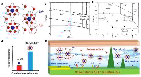The operation mechanism of ZIBs is essentially attributed to Zn2+/Zn electrochemical redox; therefore, the reversibility of the deposition/stripping behavior is incredibly valuable to achieve stable and long operation features of ZIBs [34,35]. It is well known that the electrolyte system dominates the electrochemical energy storage system, and there are two main electrolyte systems for ZIBs, alkaline and weakly acidic system. The reactions carried out at the zinc anode in above two environments are different. In general, Zn2+ ions are coordinated in the electrolyte with six H2O molecules in the solvated structure of (Zn(H2O)6)2+, as described in Figure 2a. The solvated active water molecule is easily decomposed into H+ and OH at the interface between the anode and electrolyte. H+ gradually accumulates on the anode to obtain electrons and generates H2, while OH is transformed into a by-product. The solvation effect induces the charge transfer through the O–H bond of the solvated Zn2+, weakening the hydrogen bond created by the movement of electrons from the bonded molecular orbital of the ligand water to the unoccupied Zn2+ orbital [36]. In alkaline electrolytes, the O–H bonds in the solvated (Zn(H2O)6)2+ are prone to be adsorbed by the more strongly O–H bonds in the electrolyte, forming the Zn(OH)2 complexes. By further deprotonation to form the Zn(OH)42−, the severe concentrated polarization promotes the inhomogeneous distribution of zincate during the consumption of the zincate in the electrolyte around the anode, which is then converted into passivated zinc oxide deposits [15,37]. The detailed reaction formula is presented as follows.