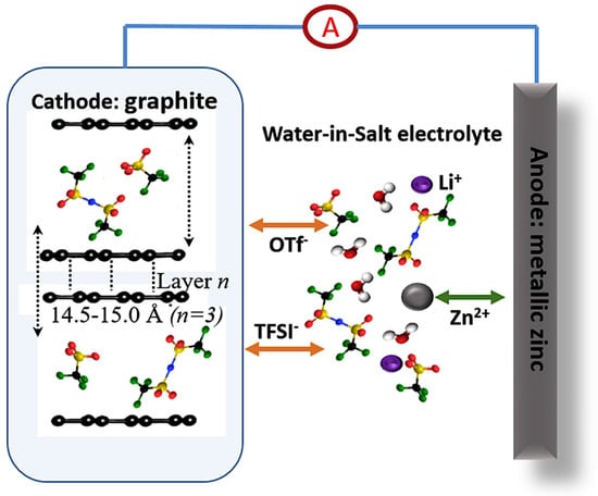 In addition to directly increasing the concentration of zinc salts, the addition of other salts could also change the structure of hydrated Zn2+ ions. For instance, Zhang et al. [55] constructed a WISE system using 21 M LiTFSI + 3 M Zn(TfO)2 to maximize the salt content in the electrolyte by increasing the concentration of LiTFSI. The electrochemical stability window of the anode (2.6 V vs. Zn2+/Zn) was significantly higher than that of the 3 M Zn(TfO)2, where the high salt concentration reduced the proportion of free water in the electrolyte, increased the ionic conductivity, and expanded the electrochemical stability window of the anode. After 400 stripping/plating cycles, the surface of the anode showed a homogeneous and dense morphology without the generation of zinc dendrites, and WISE system exhibited an effective inhibition of zinc dendrites, thus improving the reversibility of the anode. The constructed Zn-ion battery with the reversible anion intercalation chemistry in graphite cathode exhibited good reversible cycling performance with a Coulombic efficiency of 95%, which was comparable to that of organic electrolyte-based dual-ion batteries, as presented in Figure 4. In short, the WISE system provides wide operating voltage and unprecedented cycling stability, providing fresh possibilities for the exploitation of high-voltage rechargeable aqueous batteries.