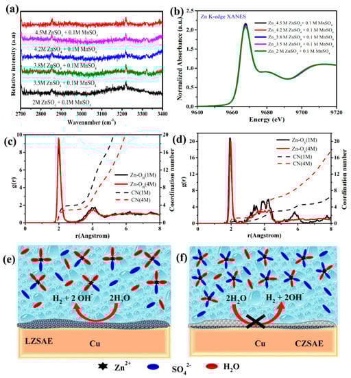 On the other hand, WISE systems could also employ high salt concentrations to decrease the activity of free water in the electrolyte and change its solvation structure by coordination with Zn2+ to achieve a controlled regulation of the unfavorable reaction. Bizualem [56] reported a concentrated aqueous electrolyte system (CZSAE, 4.2 M ZnSO4 + 0.1 M MnSO4), where the combination of electrolytes with lower concentrations was utilized to produce an electrolyte that effectively improves the cyclic stability of zinc anodes. Drawing on the Raman spectroscopic techniques, X-ray absorption spectroscopy, and molecular dynamics in aqueous solution presented in Figure 5, it could be noticed that in the low concentrated ZnSO4 aqueous electrolyte (LZSAE) containing 2 M ZnSO4 + 0.1 M MnSO4, Zn2+ is surrounded by six free water molecules in coordination. As for CZSAE, due to the change of salt concentration in the electrolyte, a high concentration of SO42− can be coordinated with Zn2+, thus changing the solventized structure of Zn2+ and reducing the generation of side reactions. Under 0.2 mA cm−2, the initial morphology of anodic zinc deposition in LZSAE showed obvious uniformity, while a non-uniform, dust-like bump was formed after 10 cycles, indicating the production and growth of zinc dendrites. On the other hand, the zinc deposition on the anodic surface was more uniform and regular in CZSAE, forming a stable zinc layer. As a result, a highly stable and reversible Zn/MnO2 cell with 88.37% capacity retention was obtained after 1200 cycles at 938 mA g−1 with dendritic-free homogeneous Zn plating.