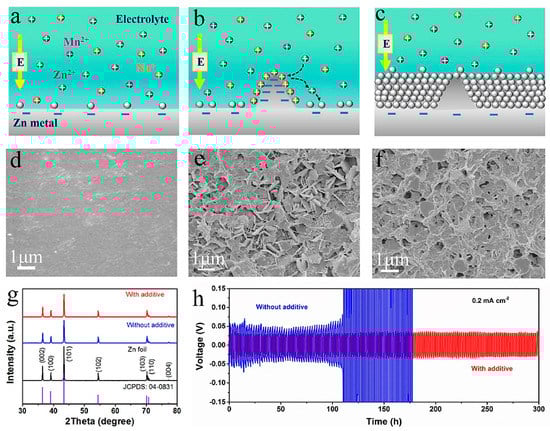 The anions, including Br, I, and I3, exhibit suitable redox potentials and good cyclic durability, which could be also developed as an additive in ZIBs [74,75,76]. Liu et al. [69] introduced I3 as an ionic additive into the electrolyte and found that the oxidizing I3 could react with Zn2+, where the passivation effect of the Zn anode surface by the oxidizing I3 prevented the rapid evolution of detrimental Zn dendrites while concurrently inhibiting corrosion and HER. The fresh Zn in ZnSO4 + KI cell failed after 180 h, while the cell with I3-pretreated Zn electrodes still worked even after 400 h, as displayed in Figure 8a. The reaction between I3 and Zn could preferentially remove the sites with high reactivity and high surface area on the Zn anode, which could easily offer a convenient environment for the generation of Zn dendrites. As a result, the uniform deposition of Zn2+ was achieved with the help of I3. Meanwhile, the reaction between I3 and Zn also competed with the side reaction, where the competing reaction changed the morphology of Zn4(OH)6SO4-xH2O layer and reduced the occurrence of side reaction, as depicted in Figure 8d–e. Unfortunately, it is difficult for I3 to form a dense protective film, and the long-term loss of zinc anode is unavoidable; the solution can only be an effective supplement to solve the zinc dendrite problem.