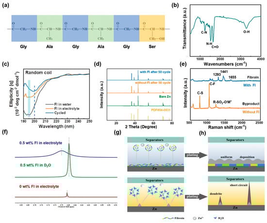 The strong interaction between zinc ions and water molecules affects the Zn2+ desolvation and nucleation process in conventional electrolytes, which results in the disordered growth of zinc dendrites. The solventized sheath generated by [Zn(H2O)6]2+ can be further hydrolyzed by Zn2+ to produce [Zn(OH)]+ and H+, which will lead to the formation of zincate by-products and corrosion [39]. Organic additives are rich in functional groups that can improve the desolvation process of Zn2+ by interacting with H2O and Zn2+. A safe, low toxicity, and low-cost organic additive to achieve the inhibition of Zn dendrites using fibronectin (FI) that are rich in functional groups (-NH, -OH and -CO) was proposed by Zhu et al. [59]. As displayed in Figure 9, the abundant functional groups not only allowed the FI molecules to adsorb on the anode in a targeted position model, creating an interfacial protective layer, but also interacted with H2O, thereby modulating the solventized sheath structure of Zn2+, achieving uniform and dense deposition of Zn on the anode and reducing the occurrence of side reactions. The composed Zn/Navo full cell retained 98.4% capacity after 1000 cycles at 5 A g−1 with a high Coulombic efficiency of 99%, demonstrating the excellent performance of organic additives in improving the solventized sheath structure of Zn2+ and inhibiting Zn dendrites.