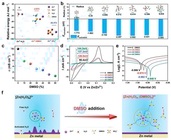Organic additives could suppress the generation of Zn dendrites via regulating the Zn2+ deposition orientation. Feng et al. [96] conducted a series of studies on dimethyl sulfoxide (DMSO) as an additive and found that DMSO exhibited a higher binding energy with Zn2+ than H2O, and the binding energy disrupted the solventized sheath structure of [Zn(H2O)6]2+, avoiding the Zn2+ deposition process from side reactions with H2O, as shown in Figure 11. DMSO could provide large adsorption energy for Zn (002) plane for the regulation of Zn2+ deposition orientation, and Zn2+ was deposited laterally along (002) plane compared with the longitudinal deposition of Zn2+ in (101) plane without the addition of DMSO. The surface adsorption energy of DMSO for (002) plane was higher than that of H2O, which made it easier to expose (002) plane during Zn2+ deposition and reduce the generation of dendrites and parasitic reactions. In addition, the experimental Zn//Zn pair cells could last for 1200 h at −20 °C without dendrites and by-products production due to the hydrogen bonding between DMSO and H2O, which led to a lower zero point of the electrolyte.