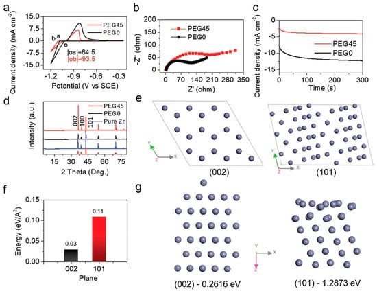 Alcohols are regarded as important additives in ZIBs, benefitting from the rich hydroxyl groups [99,100,101,102]. Cao et al. [97] proposed a new electrolyte system with 1 M Zn(CF3SO3)2 as zinc salt and polyethylene glycol (PEG) as additive to investigate the improvement of Zn2+ deposition orientation. In PEG45 electrolyte, the solvent sheath of Zn2+ and the strength of hydrogen bonding could be reasonably controlled by PEG molecules, reducing the binding of Zn2+ to H2O. On the other hand, DFT calculations in Figure 12 revealed that the adsorption energy of a single Zn atom on the (002) surface was smaller than that on the (101) surface, and the addition of PEG facilitated the targeted deposition of Zn2+ in the (002) plane with low surface energy during anodic deposition, reducing the generation of dendrites and side reactions. The cell exhibited a long cycle life of up to six times compared to the electrolyte without PEG addition, which opens up new ideas for the subsequent development of stable Zn anodes.