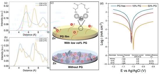 Although organic additives are a practical and effective EA, excessive amounts are not encouraged. High concentrations of organic additives, although achieving superior performance, sacrifice the advantages of aqueous ZIBs and are likely to increase the polarization loss at the electrode. Hence, low concentrations of organic additives with high efficiency should be chosen as much as possible. Shang et al. [98], taking into account of the double-side nature of organic additives, introduced a propylene glycol (PG), commonly used in food and medicine, as a non-toxic organic additive. At low concentrations, like other Zn dendrite deposition regulators, PG adsorbed onto protrusions and reactive crystal degree sites and regulated the Zn deposition rate, achieving uniform Zn growth. At the same time, PG changed the solventized sheath structure of Zn2+, replaced part of H2O, and the hydrogen bonding formed with the remaining H2O reduced the activity of H2O. As described in Figure 13, the low concentration of PG also formed a hydrophobic film spontaneously, which discharged the generated H2 from the anode surface, thus effectively inhibiting the hydrogen evolution side reaction. Under the high loading of cathode materials, the electrolyte systems with PG addition also presented good stability, and PG has great potential as a low concentration organic additive.