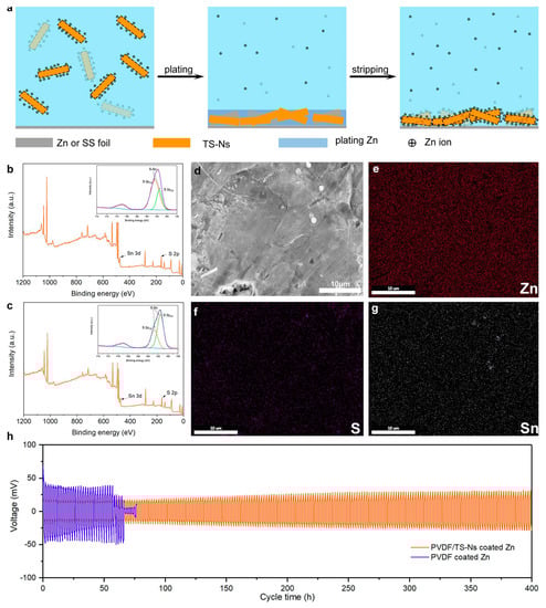 Another major class of inorganic additives that are more frequently used are 2D nanosheet materials, which possess the merits of adjustable volume, larger lateral dimensions and easily exposed active sites, non-toxicity and environmental friendliness over other additives. Zhang et al. [108] investigated 2D ultrathin anionic tin sulfide nanosheets (TS-Ns) and elucidated the mechanism that drives the homogeneous deposition of Zn2+. Initially, the TS-Ns with negative charge attracted a large number of positive Zn2+ on the surface via electrostatic interaction and increased the local concentration of Zn2+. Then, Zn2+ was co-deposited on the anode surface together with TS-Ns, which was confirmed by the XPS spectrum and SEM mapping of the sample after stripping. As a result, an interfacial protective layer was formed near the Zn anode to guide the distributed deposition of Zn and reduce the generation of Zn dendrites, as depicted in Figure 15. The cycle life of the Zn//Zn symmetric cell with TS-Ns as an additive exceeded 1850 cycles without short circuit. The experiment exhibits a good inhibition of Zn dendrites under the co-deposition of TS-Ns and Zn, which opens up new ideas for the selection of inorganic additives.