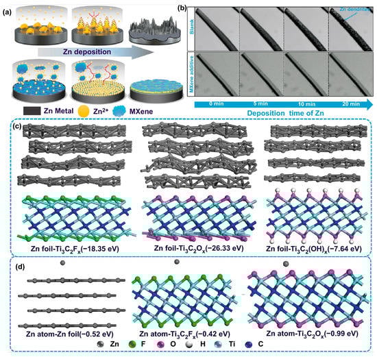 MXene emerges as a new type of compelling two-dimensional materials, which exhibits the distinctive properties of high surface area, abundant surface functional groups, metallic conductivity, strong hydrophilicity and good chemical stability [111]. Inspired by previous work involving ideal hosts for dendrite-free Li/Na/K anode [112,113], Sun et al. [109] proposed Ti3C2Tx MXene as an EA to ameliorate problems, such as anode Zn dendrites and parasitic reactions. The MXene could be adsorbed on the Zn anode to induce the uniform Zn deposition via the abundant zincophilic-O groups and subsequently participated in the formation of robust solid-electrolyte interface layer. The binding energies between -OH, -F and -O groups and metal Zn substrates were −7.64, −18.35 and −26.33 eV, respectively, revealing the powerful adhesive tendency between MXene and Zn foil, as described in Figure 16c,d. The generated MXene-Zn2+ functional layer could also homogenize the dispersion of surface Zn2+ and provide well-dispersed “seed points” to induce uniform nucleation and homogenous ionic flux in the deposition process, suppressing the growth of Zn dendrites. At 2 mA cm−2, the Zn/Zn cell exhibits a stable cycling performance up to 1100 cycles and a high Coulomb efficiency (99.7%).