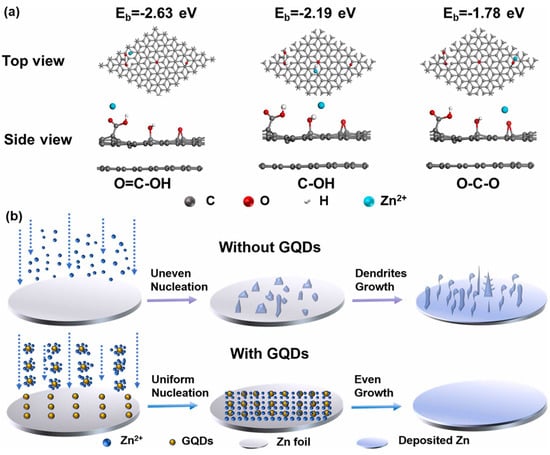 In addition, graphene-based materials including graphene quantum dots (GQDs) and graphene oxide with abundant functional groups and low toxicity at the quantum level have also been favored by many researchers [114]. Zhang et al. [110] prepared GQDs using lower cost graphite powder, which was introduced into the ZnSO4 electrolyte. As a result, electrochemically stable Zn anode was successfully constructed via manipulating the nucleation process through the introduction of hydrophilic GQDs. According to DFT analysis in Figure 17a, GQDs exhibited a stronger adsorption of Zn2+ by the rich-oxygen groups, which makes GQDs a medium to guide homogeneous Zn deposition during the repeated cycling process. The possible mechanism of GQDs in the electroplating process of zinc anode is elucidated in Figure 17b. GQDs could preferentially absorb the tip with higher potential at the anode surface and dissolve in the electrolyte. The lower nucleation potential helps to increase the nucleation sites, and the stronger binding energy oxygen-containing groups could adsorb Zn2+ to induce uniform zinc deposition. This makes Zn2+ tend to deposit on the anode surface and effectively inhibits the growth of zinc dendrites. At 0.8 mA cm−2, the Zn//Zn symmetric cell exhibited a long cycle life of 2200 h with a reduced polarization voltage of 50 mV when GQDs (0.4 g L−1) were introduced into the solution. In this research work, the graphene quantum dots demonstrated excellent performance that deserves further exploration.