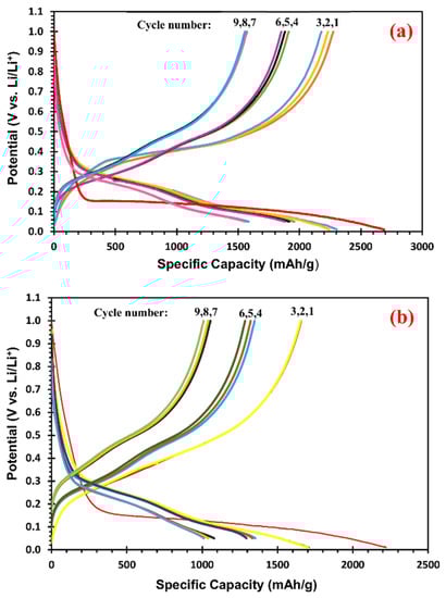 Note that all the specific capacities and current densities in Figure 2 are computed using the weight of Si@void@C active material, not Si weight. Thus, the specific capacity achieved in the 9th cycle (1553 mAh/g-Si@void@C) for the smallest size group of Si@void@C powder is equivalent to 3106 mAh/g-Si because our Si@void@C particles contain about 50 wt% Si and 50 wt% C []. Furthermore, note that the specific capacities from the 1st to 3rd cycles are similar, and the same is true from the 4th to 6th cycles and from the 7th to 9th cycles because the current density increases when changing from the 1st to 3rd cycles to from the 4th to 6th cycles and finally to from the 7th to 9th cycles. This is a well-known phenomenon, i.e., higher current density leads to lower specific capacity because of the polarization effect.