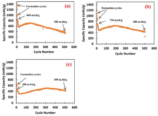 The specific capacity as a function of cycle numbers: (a) M1 cell, (b) M2 cell, and (c) M3 cell. All of them are made of Si@void@C powder without particle classification. Further, all of them have the same service cycles. The different specific capacities and cycle stabilities are due to different lower cutoff voltages in formation cycles. See Table 2 for detailed charge/discharge protocols. The specific capacities at the 1st and 500th service cycles are indicated for each cell.
