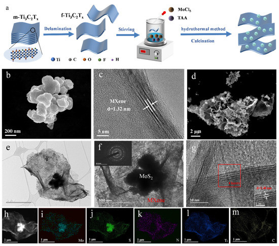 (a) Schematic diagram of the synthesis process of MoS2/MXene. (b) SEM images of MoS2; (c) HRTEM images of MXene; (d) SEM images of MoS2/MXene; (e–f) TEM images of MoS2/MXene, where inset (f) is SEAD pattern of MoS2/MXene; (g) HRTEM images of MXene in the MoS2/MXene composite, where inset is its HRTEM image at higher magnification; (h–m) elemental mapping of MoS2/MXene.
