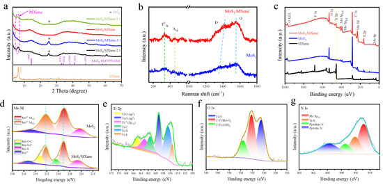 (a) XRD patterns of MoS2/MXene−x:1 (x = 2, 3, 4, 5) and MXene; (b) Raman spectra of MoS2/MXene composites and MoS2; (c) XPS full spectra of MoS2/MXene, MoS2 and MXene; high-resolution (d) Mo 3d XPS spectra of MoS2 and MoS2/MXene; high-resolution (e) Ti 2p (f) O 1s and (g) N 1s XPS spectra of MoS2/MXene.