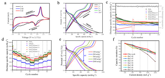 The corresponding charge/discharge profiles for different cycle times at 100 mA g−1 are illustrated in Figure 3b. The plateaus of 1.37 and 1.8 V for the discharge process relate to the formation of LixMoS2 and Li2S, while the plateaus of 1.6 and 2.3 V for the charging process are equivalent to the oxidation of Mo or the de-lithiation of LiyTi3C2Tx and Li2S, which is in line with the results of the CV curves. The initial Coulombic efficiency (ICE) of the material was calculated to be 81.60%, which was far superior to pure MoS2 and MXene, followed by a Coulombic efficiency of 96.24% in the second cycle, and it was able to maintain a high Coulombic efficiency in the subsequent cycles (98.99% at 50 cycles and 99.36% at 100 cycles). In addition, the composite has a low capacity decay rate and good cycling performance with charge/discharge capacities of 719/731 mA h g−1, respectively, after 100 cycles. The lower Coulombic efficiency in the first cycle may be due to irreversible capacity decay and the decomposition of electrolytes for SEI. The cycling performance of the MoS2/MXene electrode and the counterparts with different MoS2 and MXene ratios at 100 mA g−1 was investigated (Figure 3c). It can be found that the MXene with unique structure delivers a very stable cycling performance (maintaining 94% capacity retention compared to the third cycle after 100 cycles). Pure MoS2 electrode behaves with a first discharge capacity of 1261 mA h g−1, but the discharge capacity drops to 588 mA h g−1 after 100 cycles. This could be attributed to the structural collapse caused by the volume expansion during the charging and discharging process. When incorporating with MXene, the volume expansion problem can be alleviated, and thus the cycling stability can be enhanced. All electrodes show capacity decay in the first 20 cycles, which could be due to the formation of SEI film. Among different compositions, the MoS2/MXene electrode behaves the best cycling stability, retaining a discharge capacity of 731 mA h g−1 after 100 cycles and having a Coulombic efficiency of approximately 99%. In comparison, the MoS2/MXene-2:1, MoS2/MXene-3:1 and MoS2/MXene-5:1 electrodes retain reversible capacities of 534 mA h g−1, 704 mA h g−1 and 691 mA h g−1, respectively. For the MoS2/MXene-2:1 and MoS2/MXene-3:1 electrodes, the cycling stability of the materials was improved compared to the pristine MoS2, but the capacities were lower due to the large proportion of MXene content, while the capacity decay was more serious for MoS2/MXene-5:1, probably due to the high MoS2 content, meaning the active material would accumulate and agglomerate on the MXene surface. By the above comparison, the electrode MoS2/MXene with the ratio of 4:1 behaves with the most excellent electrochemical properties. Moreover, the electrochemical properties of the MXene was studied (Figure S9), and it delivers a first discharge capacity of 355 mA h g−1 with initial Coulombic efficiency of only 40%. Additionally, the rate performance of these electrodes was also investigated at different current densities (Figure 3d). The capacity of MoS2/MXene at current densities of 100, 200, 500, 1000 and 2000 mA g−1 were 834 mA h g−1 (3rd cycle), 778 mA h g−1 (13th cycle), 713 mA h g−1 (23rd cycle), 655 mA h g−1 (33rd cycle) and 526 mA h g−1 (43rd cycle), respectively, and when the current density backed to 100 mA g−1 again, the capacity could be retained at 852 mA h g−1 (83rd cycle). Clearly, the capacities of the MoS2/MXene-2:1 and MoS2/MXene-3:1 electrodes at different current densities were higher than those of pure MoS2 electrode under the same conditions. For MoS2/MXene-5:1, although the reversible capacity increases, the rate performance decreased due to the aggregation and destruction of the composite structure during cycling, which is also consistent with the cycling performance results. The charge/discharge profiles of MoS2/MXene electrode at the corresponding number of cycles are shown in Figure 3e. As can be seen, although the overpotential (ΔV) increases with the current density, it still retains a clear charge/discharge plateau, indicating an excellent rate performance. However, at high current densities, ion diffusion and electron transfer become slower due to the slow redox reaction resulting from the generation of the concentration polarization [42,43,44]. The capacity values of different materials at the 3rd, 13th, 23rd, 43rd, 53rd, 63rd, 73rd and 83rd cycles are listed in Table S4. In addition, the electrochemical performances of previously reported MoS2-based electrodes are summarized in comparison with the MoS2/MXene electrode in this work (Figure 3f) [29,45,46,47,48,49,50]. It can be seen that at different current densities the capacity retention of this work is at a relatively high level.