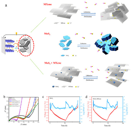 (a) Schematic diagram of the processes of lithiation and de-lithiation in MXene, MoS2 and MXene/MoS2; (b) Nyquist plots of MoS2, MXene, MoS2/MXene−2:1, MoS2/MXene−3:1, MoS2/MXene and MoS2/MXene−5:1 after the first charge/discharge cycle; GITT results of (c) MoS2 and (d) MoS2/MXene.