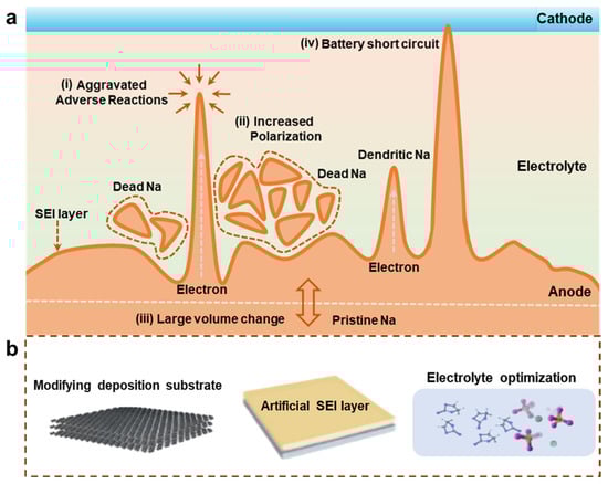 (a) Scheme of dilemmas for the Na metal anode. (b) Three main strategies to resolve the dilemmas for the Na metal anode.